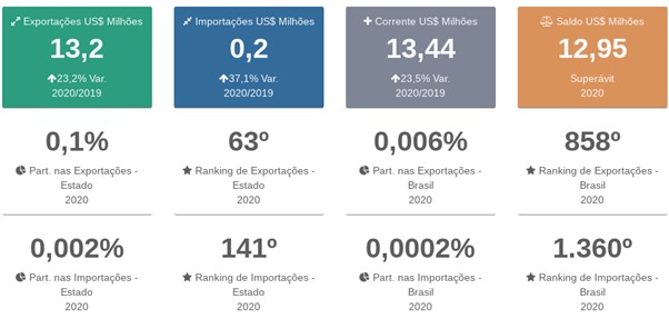 Em 2020 as exportações do município totalizaram US$ 13,2 milhões e as importações US$ 0,2 milhões. Quando comparadas com o ano anterior, as exportações tiveram um acréscimo de 23,2%, às importações também tiveram um acréscimo porém um pouco maior de 37,1%. A corrente de comércio finalizou em US$ 13,44 milhões, representando um aumento de 23,5% em relação a 2019 e o saldo comercial fechou em superávit de US$ 12,95 milhões.