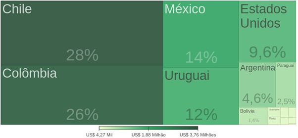 Em 2020, o Chile foi o maior parceiro comercial do município com 28% do montante total, seguido pela Colômbia com 26%, em terceiro lugar encontra-se o México com 14%, fechando nosso top 4 está o Uruguai com 12%.
