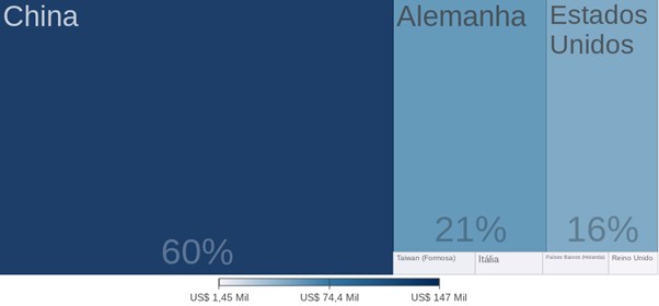 Na importação, o maior parceiro comercial de São Ludgero é a China representando sozinha 60% do montante total, em segundo lugar encontra-se a Alemanha com 21%, e fechando nosso ranking aparece o Estados Unidos com 16% do montante total.
