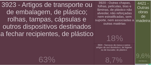 Em primeiro lugar representando mais da metade do montante total das exportações do município com 63% está o setor HS 3923 (Artigos de transportes ou de embalagem), seguido pelo HS 3920 (Outras chapas, folhas, películas) com 18%, em terceiro lugar com 9,6% está o setor HS 4421 (Outras obras de madeira), e fechando o top 4 encontramos o HS 3924 (Serviço de mesa).