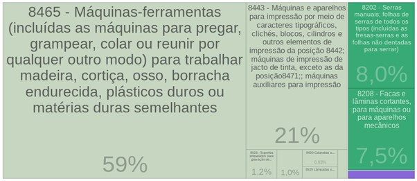 E na importação, quem lidera é o HS 8465 (Máquinas-ferramentas) com 59%, seguido pelo HS 8443 (Máquinas e aparelhos para impressão) com 21%, com 8,0% está o HS 8202 (Serras manuais) e fechando nosso ranking encontra-se o HS 8208 (Facas e lâminas cortantes) com 7,5%.