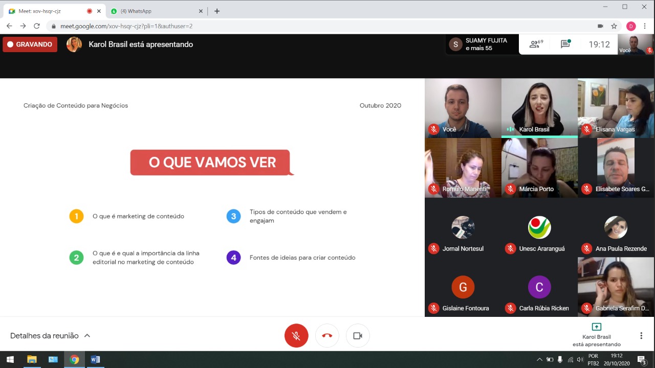 A Unesc Araranguá tem proposto trocas de conhecimentos que possibilitem a expansão e o desenvolvimento dos empreendimentos locais no Sul e Extremo Sul catarinense. Entre as iniciativas, na terça-feira (20/10) foi o dia de aprender sobre “Criação de conteúdos para negócios” em uma formação gratuita. O momento foi virtual e ministrado pela mestre em Desenvolvimento Socioeconômico formada na Unesc e mentora de Marketing Digital, Karoline Brasil de Oliveira Ezequiel.