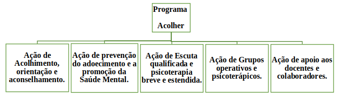 Ação de Acolhimento, Orientação e Aconselhamento: Os atendimentos de acolhimento, orientação e aconselhamento serão atendimentos breves e pontuais que, em essência, buscarão auxiliar os estudantes no enfrentamento das dificuldades emocionais que impactam naquele momento em sua vida pessoal, familiar e social. O Acolhimento pode ser estendido e ocorrer em até cinco sessões, auxiliando no alívio das questões emergenciais do estudante. Entretanto, essa ação vem com a intenção de reforçar a promoção da cultura de saúde mental no espaço acadêmico por meio do desenvolvimento de competências, habilidades pessoais e sociais, psicoeducação e autocuidado.