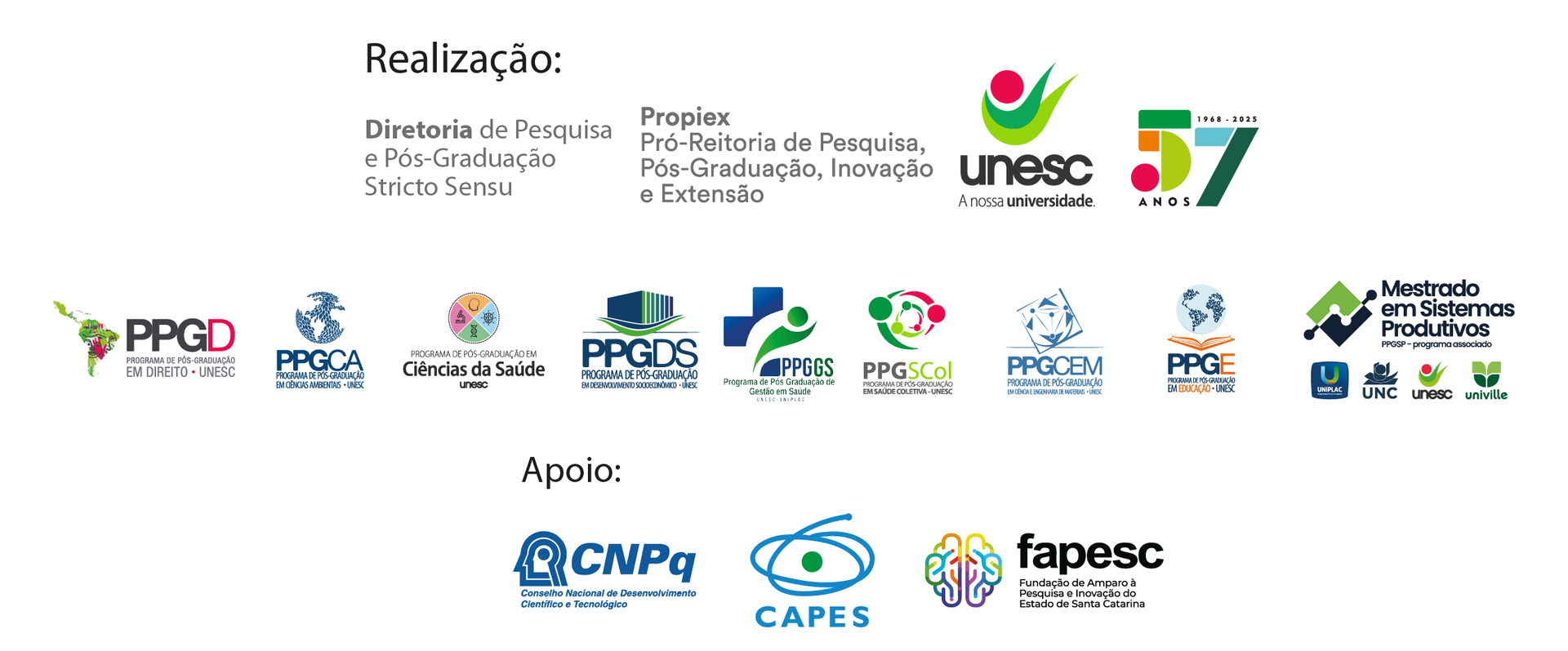 Acontece nos dias 24 e 25 de julho de 2025, realizado pela Universidade do Extremo Sul Catarinense (Unesc), de forma presencial, proporcionando o envolvimento dos diferentes atores da pós-graduação stricto sensu e o alinhamento com as novas demandas requeridas para o seu desenvolvimento.